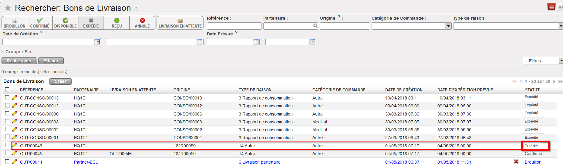 Le statut du OUT passe de “Expédié” à “Reçu”.