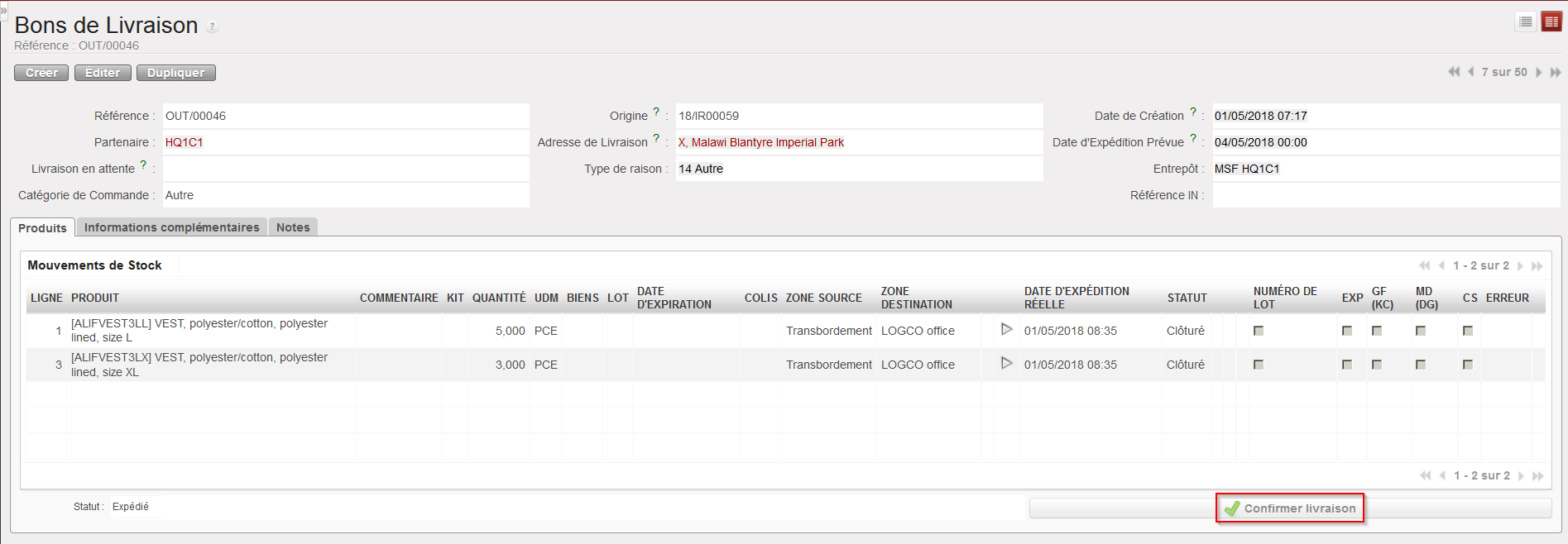 Un Bon de Livraison doit être confirmé une fois la livraison réceptionnée par le client. Le statut du OUT passe alors de “Expédié” à “Reçu”.