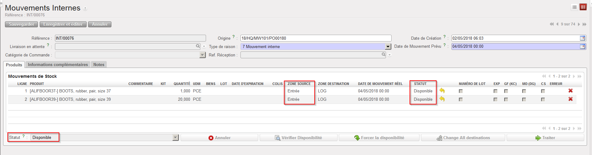 Mouvements Internes avec “Entrée” comme zone source