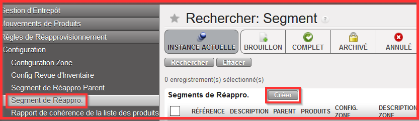 Aller à : Entrepôt /Règles de Réapprovisionnement / Configuration/ Segment de Réappro.
