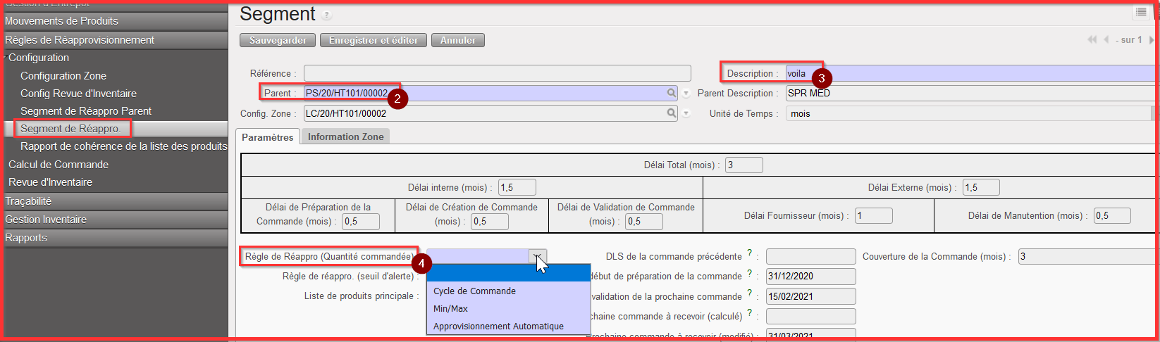 - Remplir le champ “Description Segment Réapprovisionnement” avec votre propre description/ nom de Segment de Réapprovisionnement