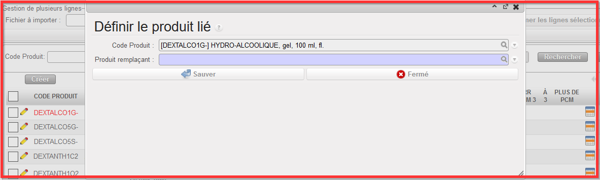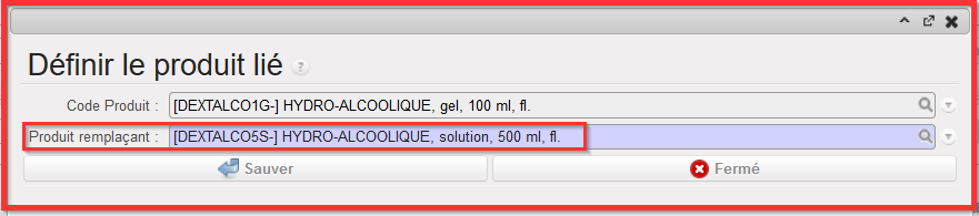 - Sélectionner le “Produit Remplaçant” à partir du popup “Définir le Produit lié”