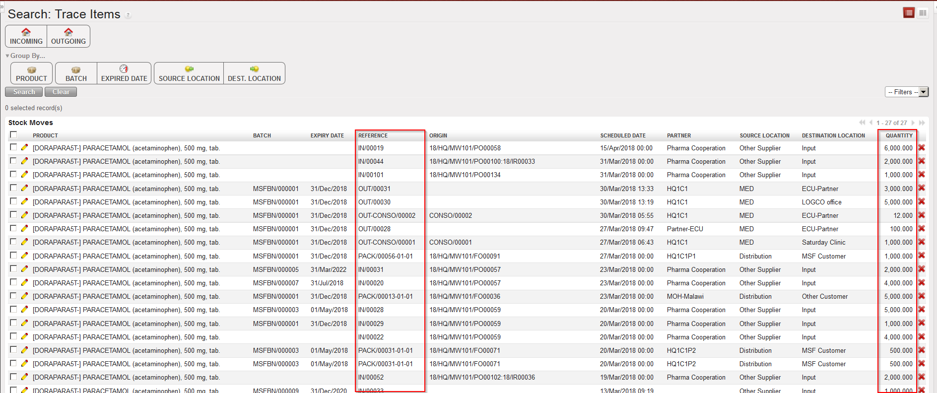 The functionality “Trace Item” available via Warehouse / Traceability / Trace Item provides visibility on a product’s movements as it lists all IN, OUT and PACK (i.e. PPL which is on a sub SHIP with status at least “Shipped“) movements in which the product is involved. In addition to the product, batch and expiry date, it shows the reference of the document, the origin, the scheduled date, the involved partner, the source location, the destination location and the quantity.