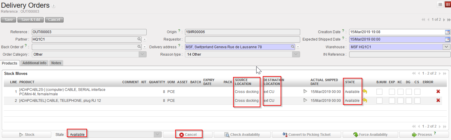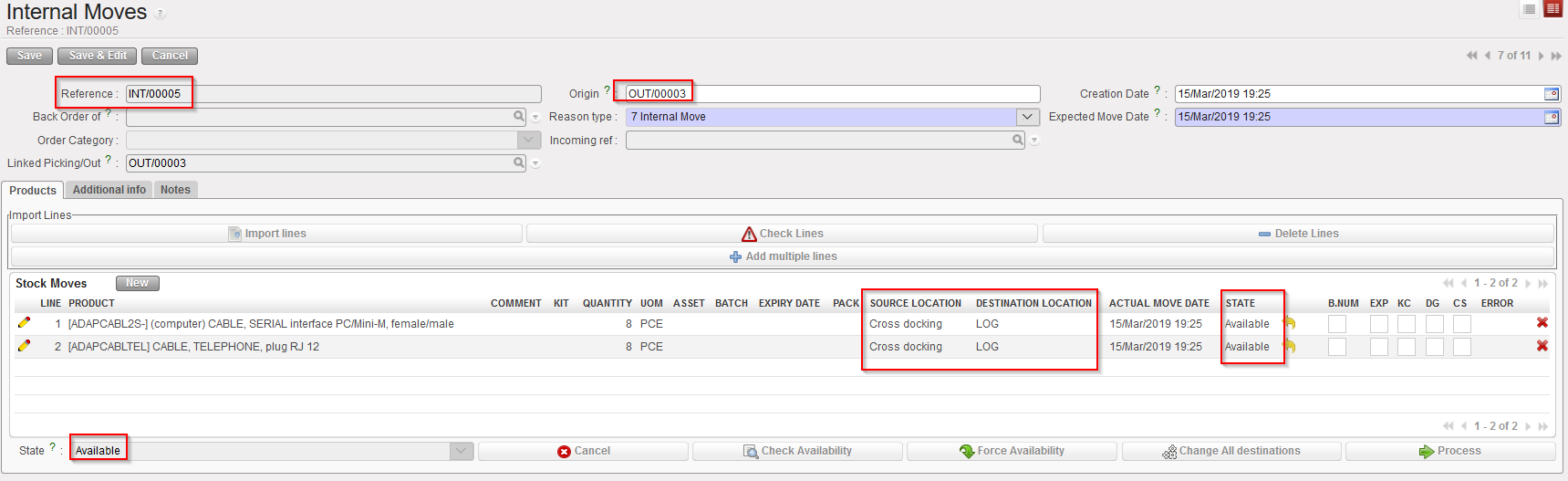 b) Click on “Cancel & create Internal Move” to generate the creation of a new “Available” INT with “Source location” = Cross Docking and “Destination location” = MED/LOG depending on type of products