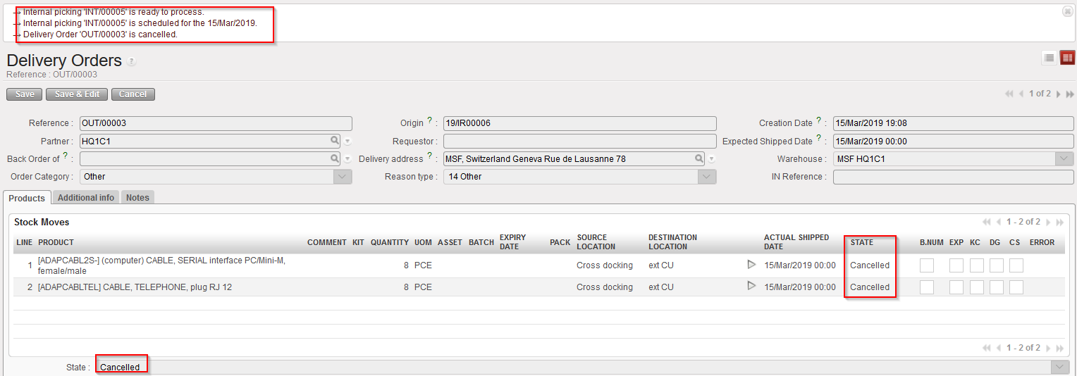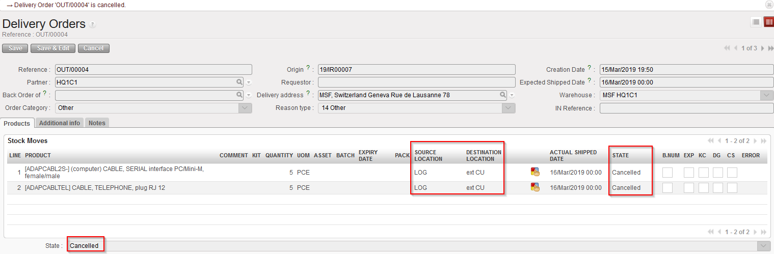 Just as PICK documents can sometimes be Cancelled, the same can happen with OUT documents. This may happen if you decide to not send the back-orders or if the requestor does not need the goods anymore. This Cancellation will directly impact the related IR and Cancel it if IR sourced from Stock or Cancel it if IR sourced to PO.