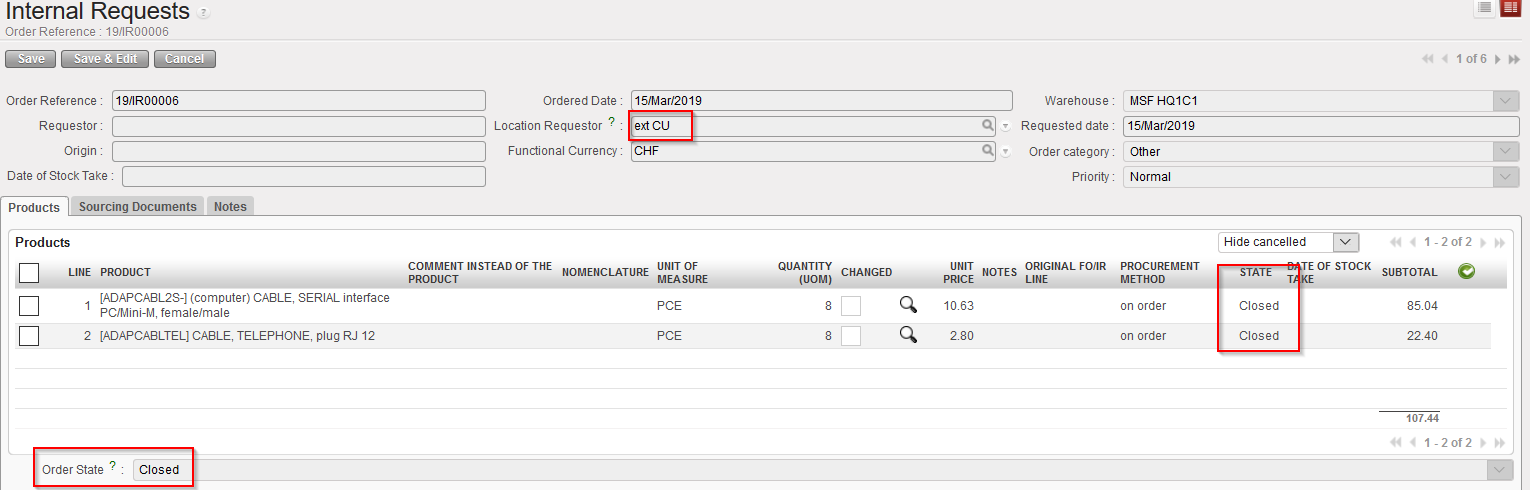 As a consequence, the corresponding IR (and all its lines) switches to the state “Cancelled” (see below).