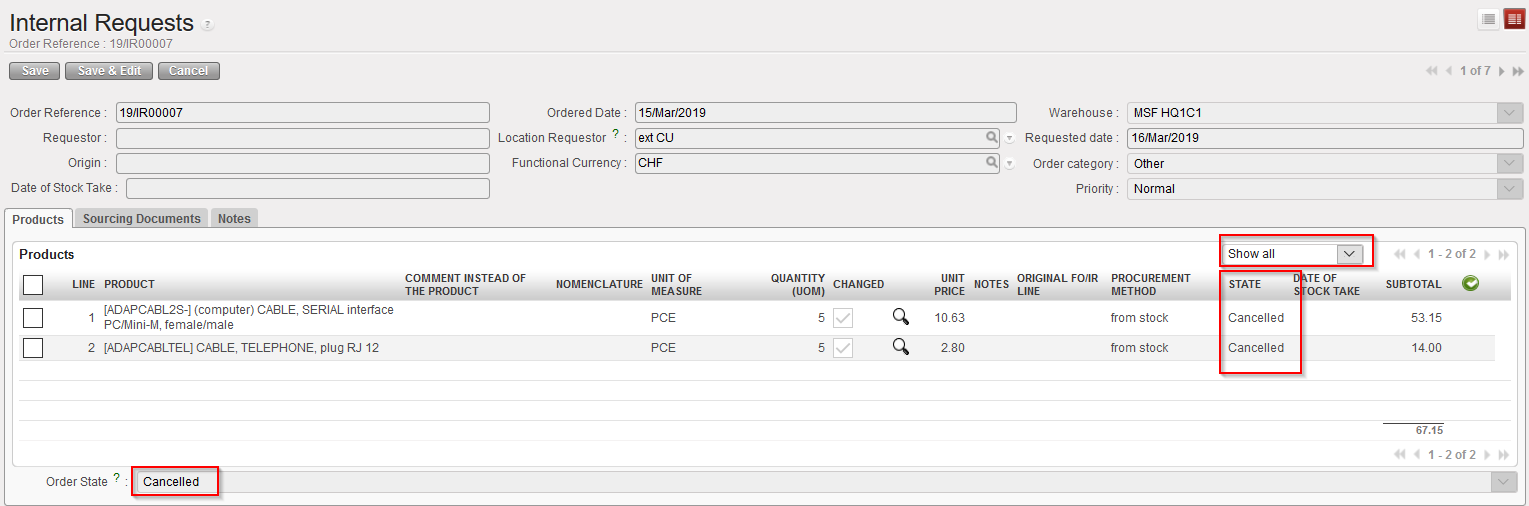 IR Cancelled following cancellation of OUT at header level (note that “Show all” filter is on) |