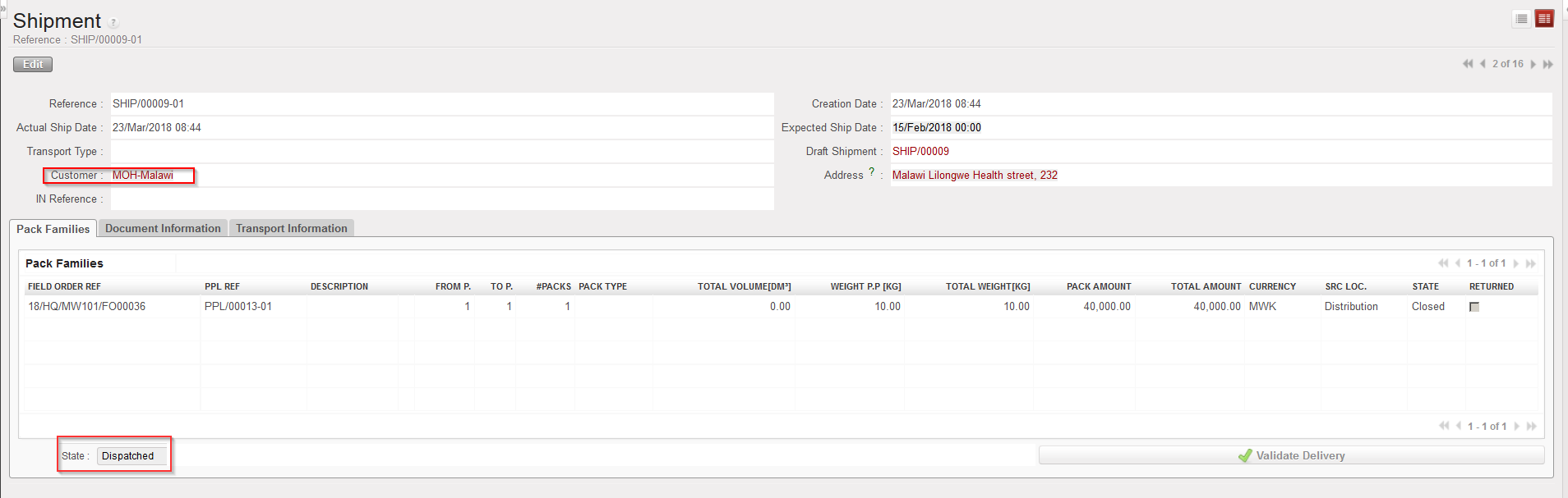 - Open the Shipment on which you want to validate the delivery. It should be a sub SHIP in the state “Dispatched” and the customer should be an external partner.