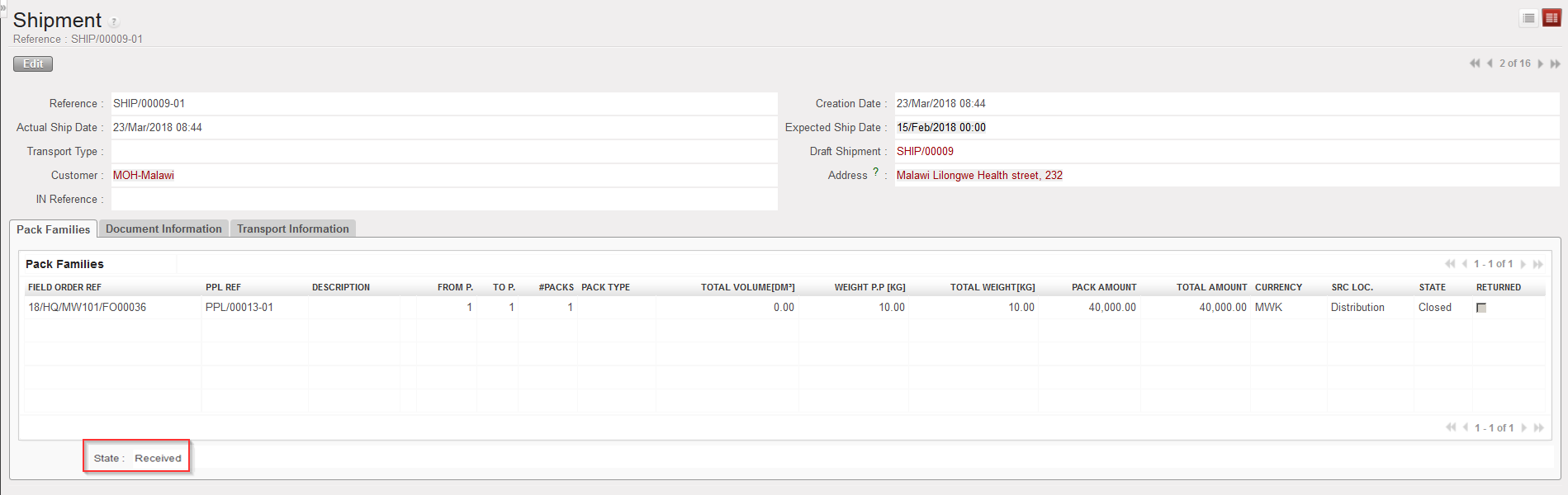 Once a delivery has been received by the consignee, this reception at the customer side should be reflected in UniField. On the Shipment, we can “Validate the delivery“.