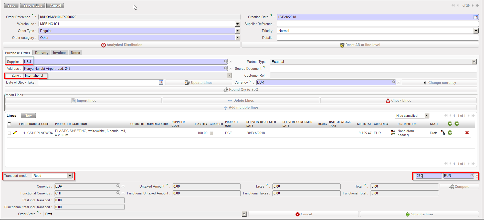 A PO is considered as international if its supplier “Zone” is “International“. In this case an additional field appears on the PO and allows recording the transport cost.