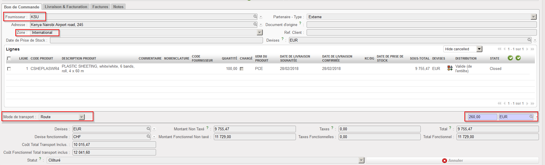 Un coût de transport peut être ajouté sur un PO s’il s’agit d’un achat international (Bon de Commande international).