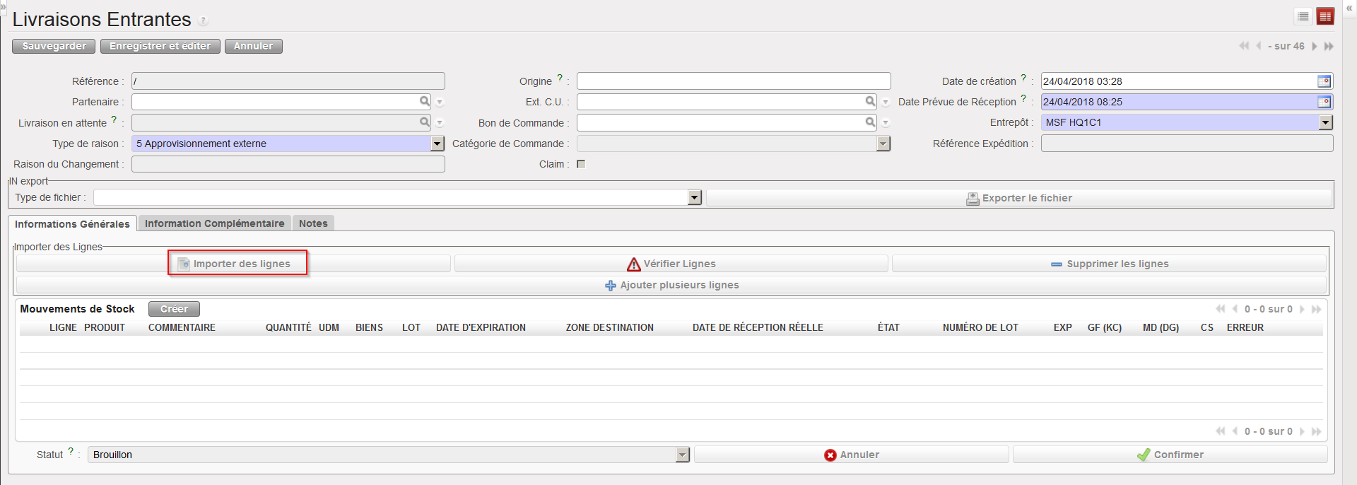 Si une Livraison Entrante est créée manuellement (from scratch), plutôt que d’entrer toutes les lignes du IN une par une manuellement, vous pouvez choisir de les importer depuis un fichier Excel. Notez que ce fichier doit être au format XML Spreadsheet 2003 et être organisé de la manière suivante.