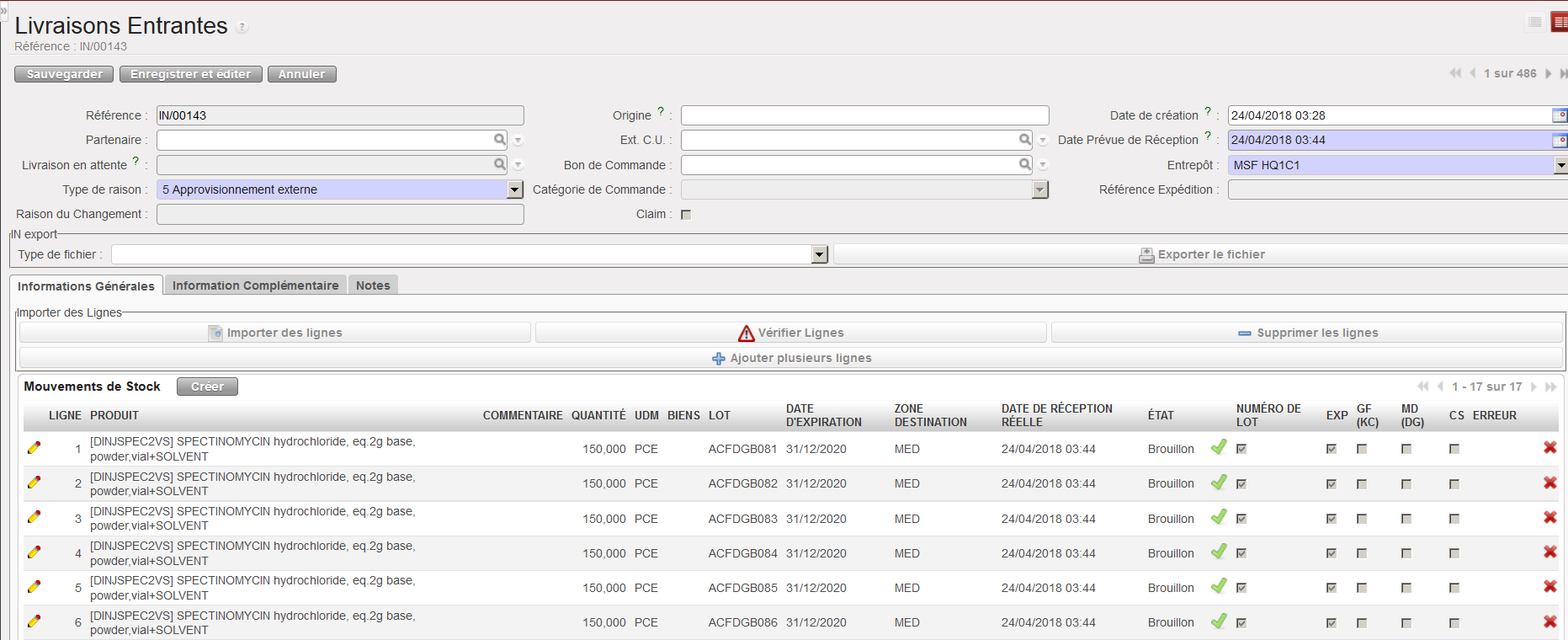 Notez que le fichier importé peut inclure des numéros de lots (BN) et des dates d’expiration (ED) en fonction des articles importés. Le cas échéant, des numéros de lots seront créés sur l’instance et seront visibles via Entrepôt / Traçabilité / Numéros de Lot. Comme nous le verrons plus tard, ces numéros de lot sont en fait des données de base car ils peuvent être réutilisés dans d’autres transactions.