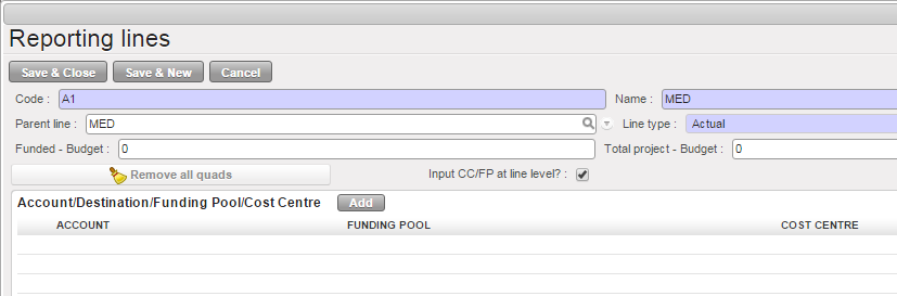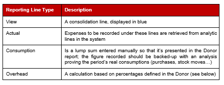 In case Donors require the reporting to be based on activities, we may have to link the same expense account to multiple reporting lines. To manage this constraint we are introducing the notion of “Quadruple”: instead of linking reporting lines with [Expense accounts, Destinations] couples, we are linking them with [Expense accounts, Destinations, Funding Pool, Cost Centre] quadruples by checking the tickbox shown below in the “Actual” reporting lines: