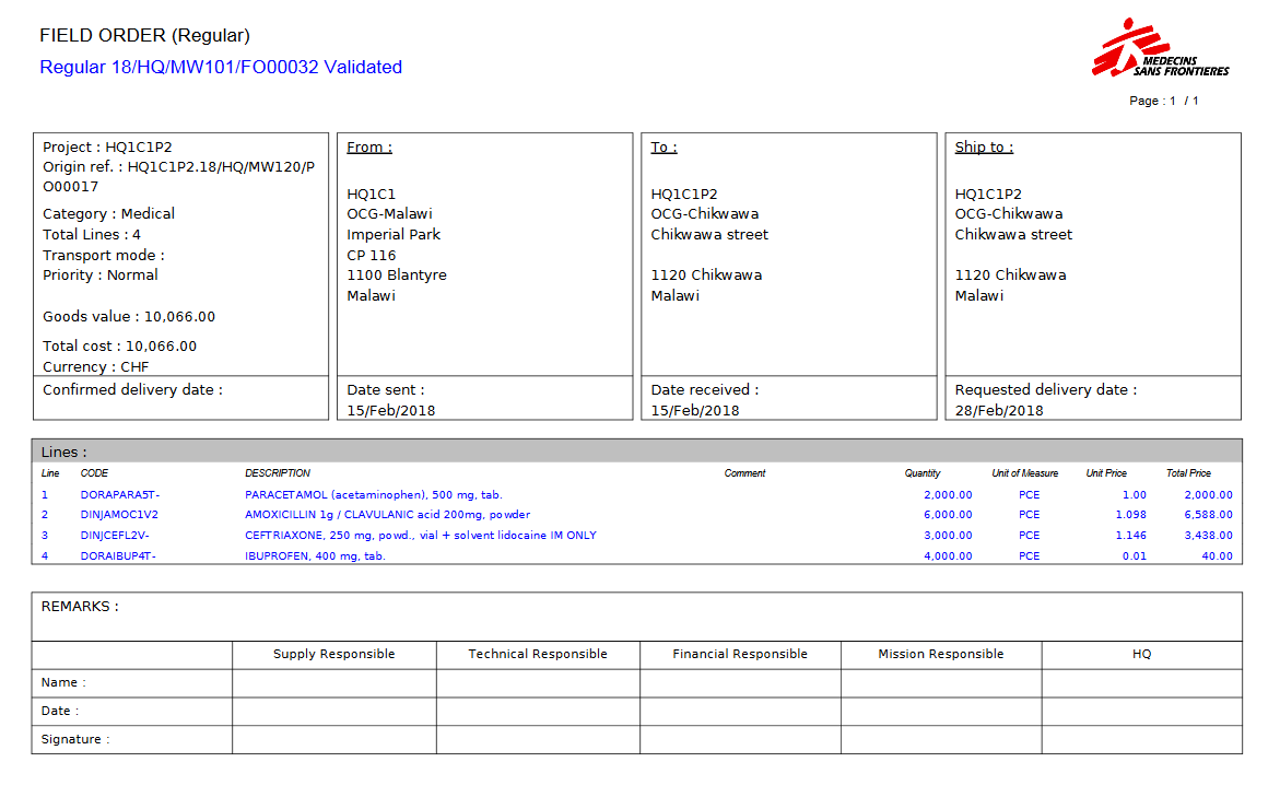 Note 4: If you export to PDF, at header level, the notes inserted on the “Notes” tab of the FO will appear (at the bottom of the PDF, behind “REMARKS”). At line level, the comment included on the “Nomenclature Selection” tab of the FO-lines will appear (in the column “Comment” of the PDF) but the notes included on the “Notes” tab of the FO-lines won’t appear.