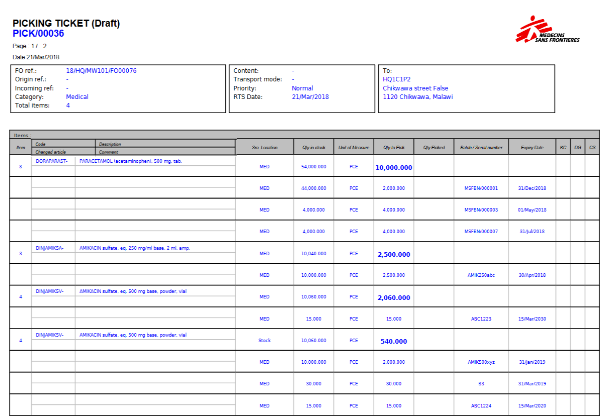 Picking Tickets can be exported to PDF and printed. As picking is actually done using sub PICKS, most of the time sub PICKS are printed to instruct the storekeeper what he/she should pick, but main PICKS are not often printed.