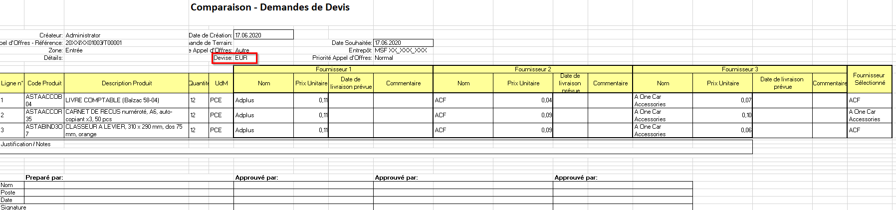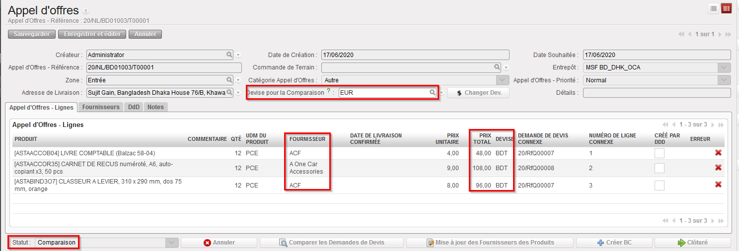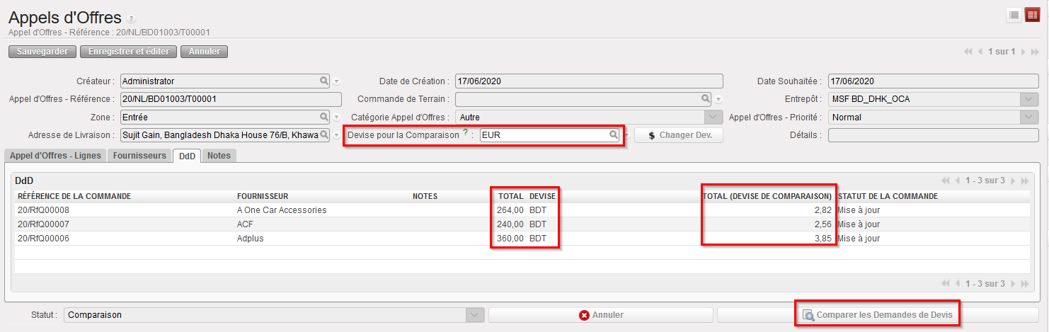 Veuillez noter que le champs “Devise pour la Comparaison” permet de sélectionner une devise parmi la devise locale, la devise fonctionnelle ou une deuxième devise locale. Cette devise sera affichée dans la fenêtre “Comparaison” après avoir cliqué sur “Comparer les Demandes de Devis » afin que l’utilisateur puisse comparer sur la base de sa devise préférée.
