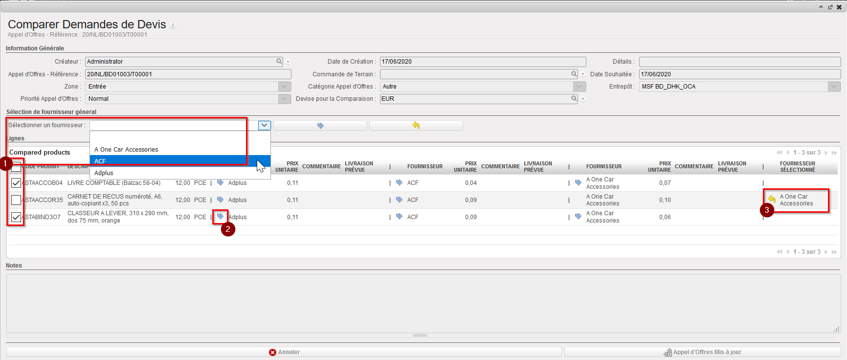 Une fois que toutes les RFQs ont été mises à jour sur base des offres envoyées par les fournisseurs et sont dans le statut “Updated”, l’utilisateur peut comparer les différentes offres et sélectionner le meilleur fournisseur pour chacun des articles demandés (dans l’Appel d’Offres).