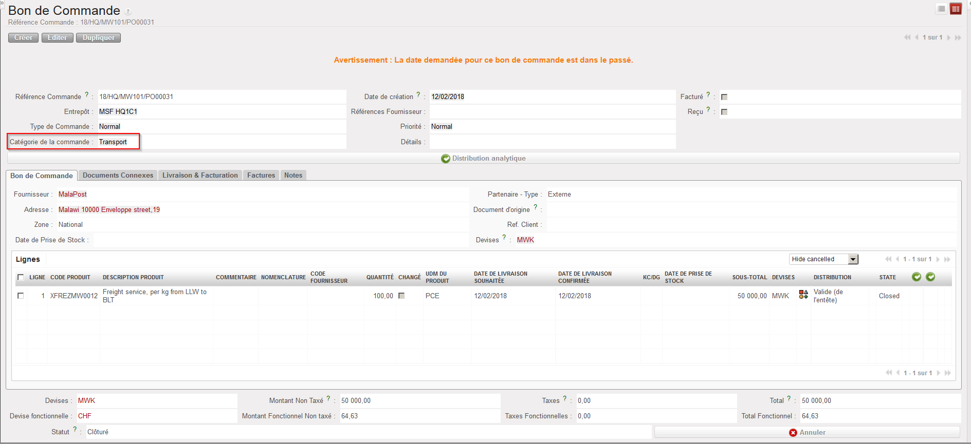Notez que les achats de transports (de services de transport) peuvent être enregistrés via cette catégorie de POs pour les achats de transport internationaux si vous préférez.