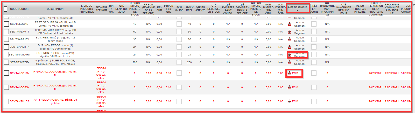 - “PCM” : liée à la Config de Revue d’Inventaire où l’on détermine le nombre de mois de projection pour couvrir la période. Une alerte PCM ici signifie que le segment ne couvre pas la période.