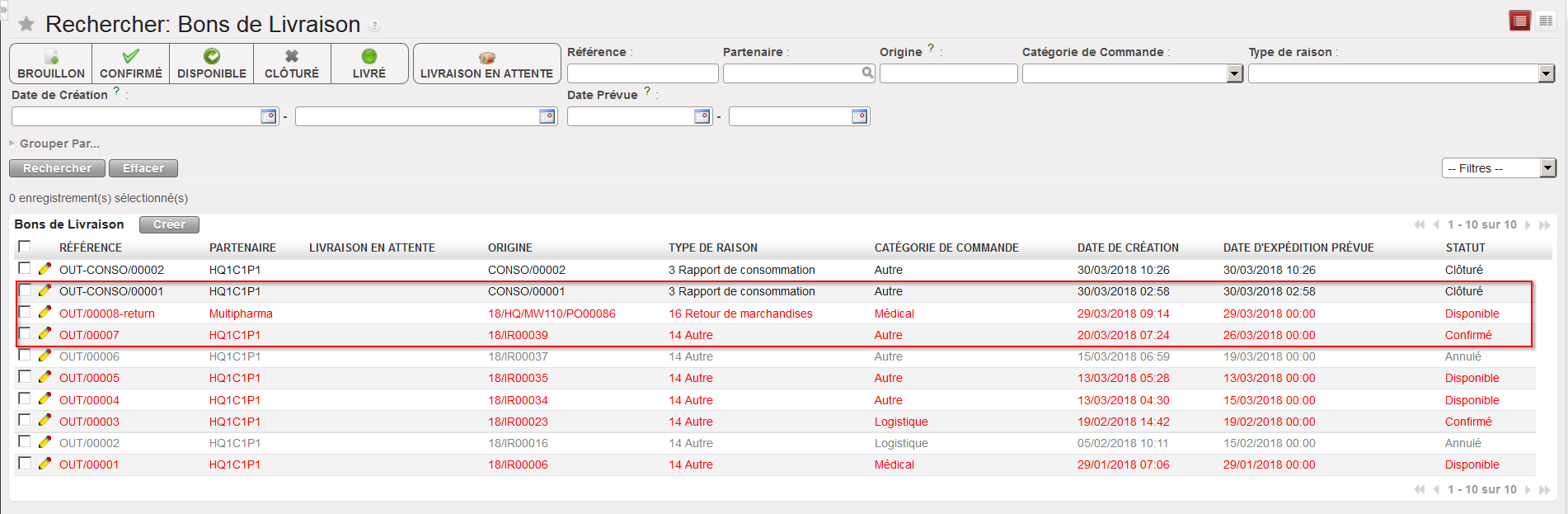 - OUT/XXXXX-return. Ce type de référence est généré par une réclamation (de type “Retour”) adressée à un fournisseur suite à une livraison non conforme. En réalité, la réclamation inclura un évènement et le traitement de cet évènement générera un Bon de Picking (PICK-return). Si ce Bon de Picking est converti en OUT (Simple Sortie), une référence OUT-return sera générée (voir LU-SU4202 sur les réclamations pour plus de détails).