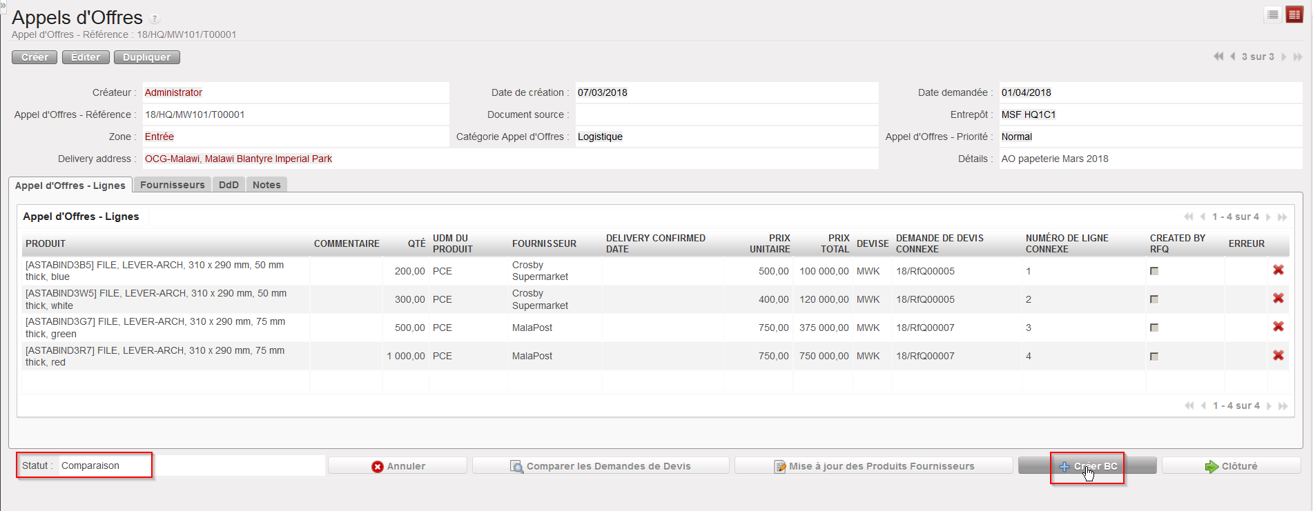 Lorsque la comparaison des offres a été faite sur un Appel d’Offres, le CFT passe au statut “Comparaison”. A partir de cette étape, un (ou plusieurs) PO(s) peuvent être générés depuis le CFT (en fonction du nombre de fournisseur sélectionnés) via un clic sur le bouton “Créer BC”.