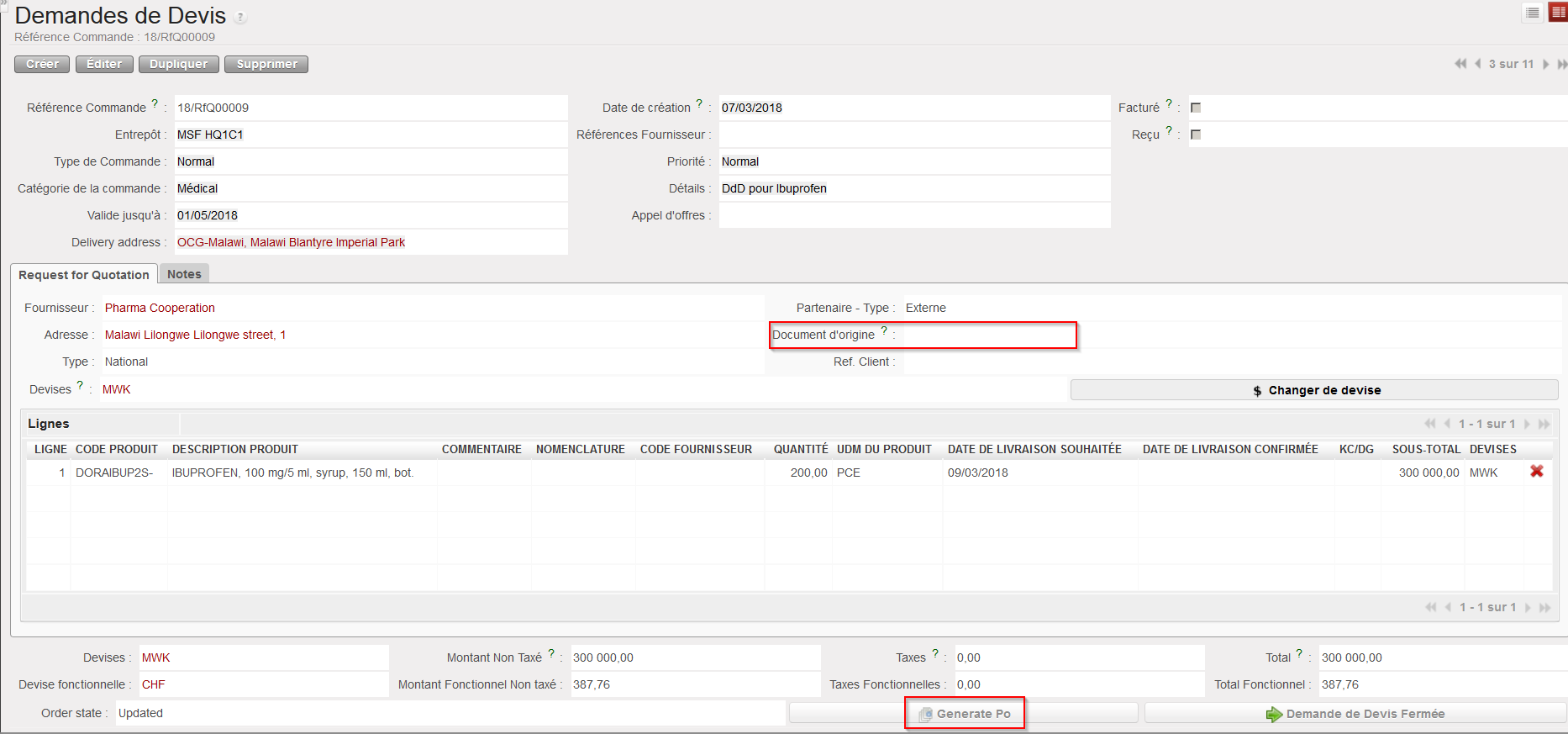 | Génération d’un PO depuis une RFQ créée manuellement |