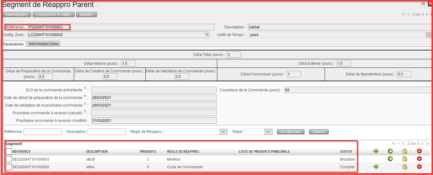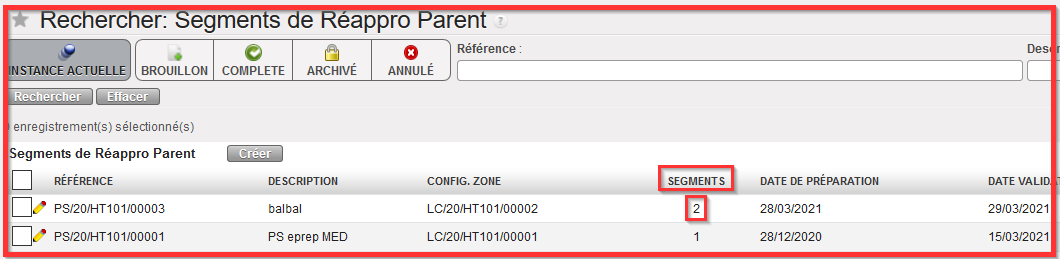 Comme vous pouvez le voir dans l’exemple ci-dessous, le chiffre “2” de la colonne Segment indique le nombre de Segment créés pour ce Segment Parent (i.e. : lié spécifiquement à ce Segment de Réappro Parent).
