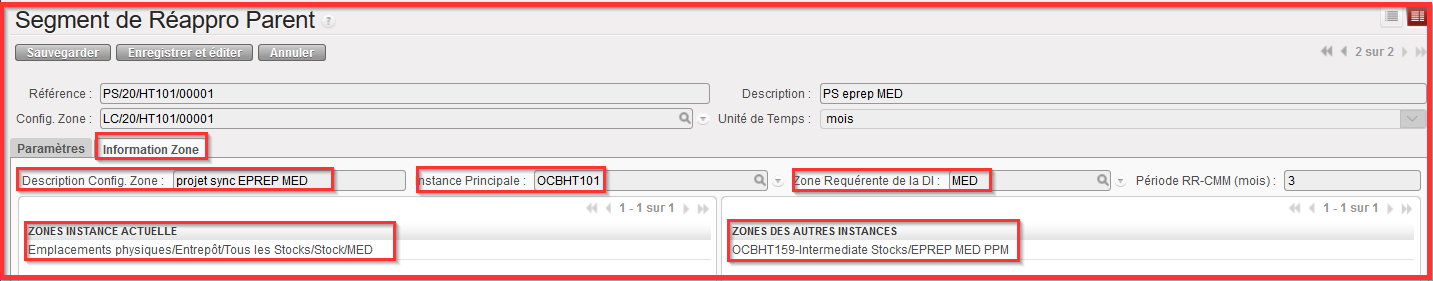 Vous pouvez voir dans l’onglet “Information Zone”, comme illustré ci-dessous, qu’il y a le Stock MED sous la zone instance actuelle et EPREP MED PPM au niveau projet. L’on peut aussi voir la Description Config Zone qui a été saisi à l’étape précédente de Configuration Zone. Il y a aussi l’instance principale OCBHT101 et la Zone Requérante de la DI (IR) (MED), ce qui signifie que la DI sera toujours générée avec la zone de Demande au niveau parent (i.e.: les biens seront livrés à la zone « MED »).