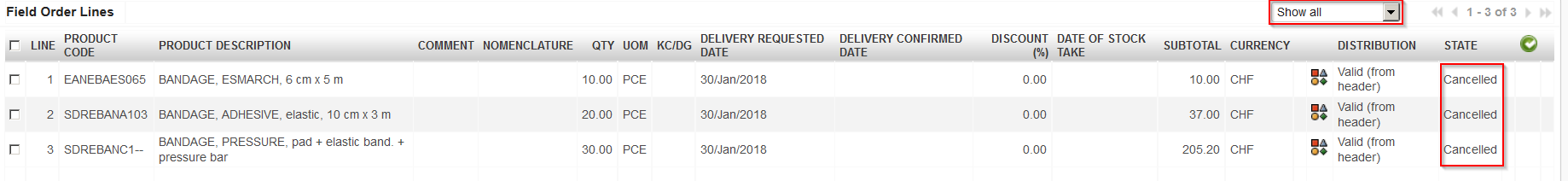 2. The FO will switch to the state “Cancelled”. You will see that the FO lines do not appear anymore. That’s because they are also in the state “Cancelled”. You may see them if you use the drop-down filter at the top of the “Field Order Lines” table which allow you to show the cancelled order lines.