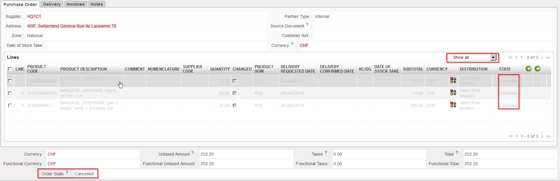 In case the Coordination does not agree on the whole order, or if they are unable to meet the demand, the complete order will have to be cancelled. The PO at project level will be cancelled too after synchronization.