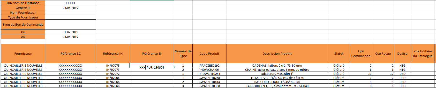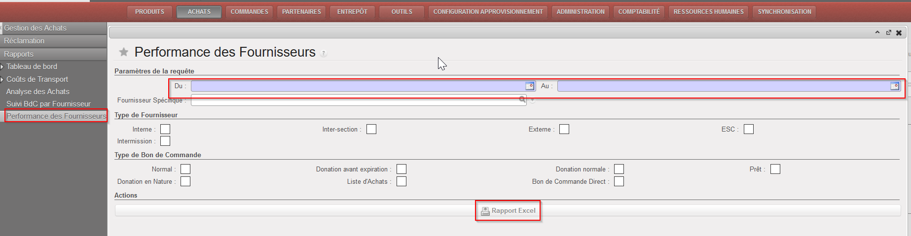 - Sélectionner un filtre pour affiner le besoin: Du (obligatoire), Au (obligatoire); Fournisseur spécifique; Type de Fournisseur; type de Bon de Commande