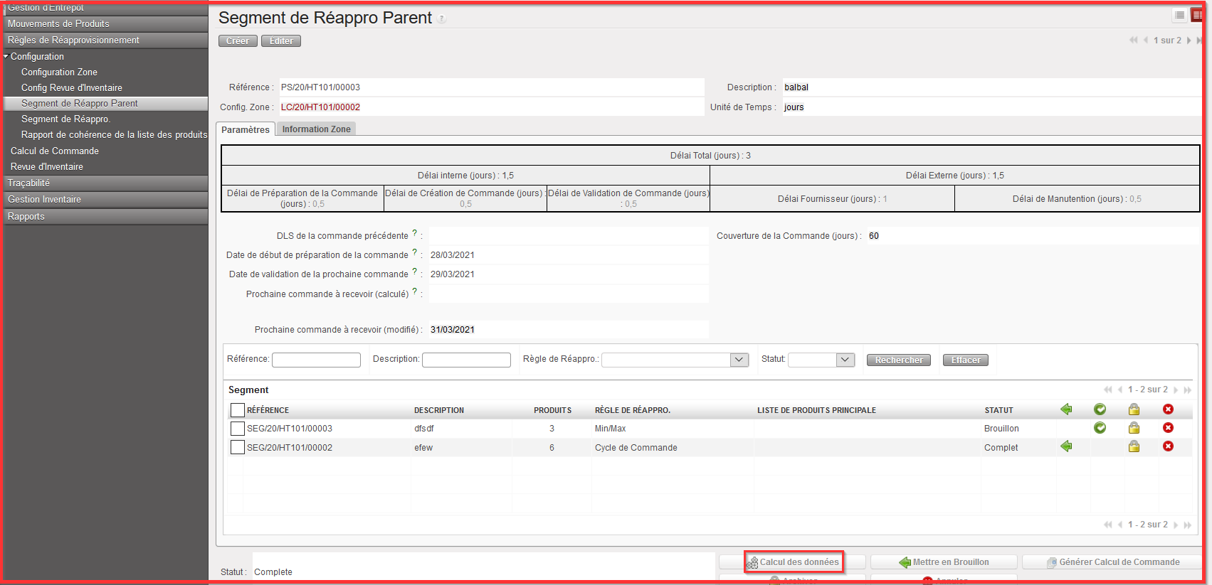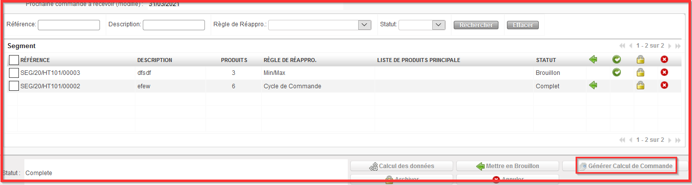 Après avoir cliqué sur le bouton “Générer Calcul de Commande” vous obtenez la notification de message en haut de l’écran “Segment de Réappro Parent” informant sur le Calcul de Commande générée. Il se génère automatiquement pour toutes les Références Segment de Réappro (toutes les lignes).