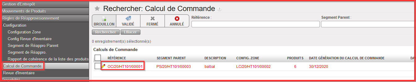 Le calcul de Commande permet d’exporter les « DI » et « BdC » à partir des « RR » configurées aux étapes précédentes. Afin de générer ces Calculs de Commande, retourner au “Segment de Réappro Parent” et sélectionner la référence de Segment de Réappro Parent qui y existe et qui doit être exécutée.