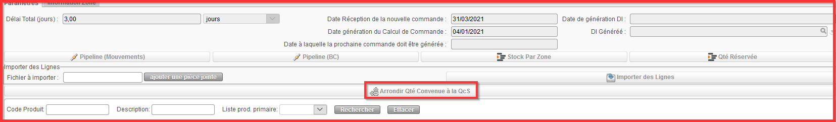 - Cliquer sur “Arrondir Qté Convenue à la QcS” ce qui arrondira les quantités dans “Qté de Commande Convenue” à partir de toute valeur QcS trouvée dans la fiche produit de l’instance principale.