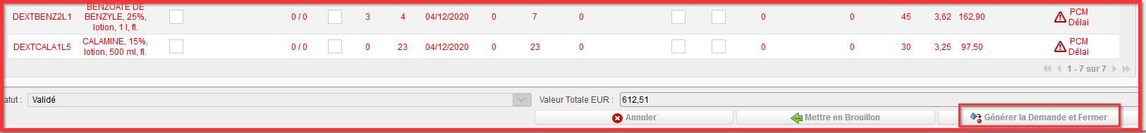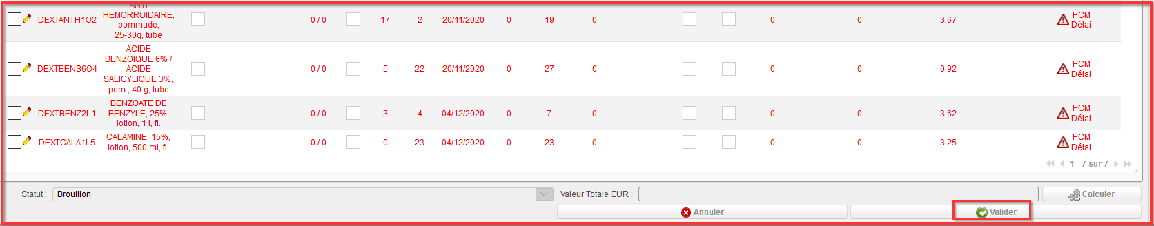 7. De retour à l’écran « Calcul de Commande », lorsque les valeurs sont corrigées pour chaque ligne produits, cliquer sur le bouton “Valider”.