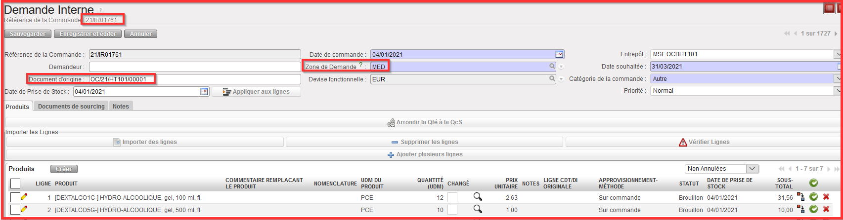 Lorsque vous cliquez sur “Générer la Demande et Fermer”, le Calcul de Commande est Terminé. Un nouveau message est affiché en haut de l’écran nous informant de la nouvelle référence de la DI créée (e.g. 20/IR xxx) à partir de la référence spécifique du calcul de Commande (e.g. OC/20/BDO xxxxx) comme illustré ci-dessous.