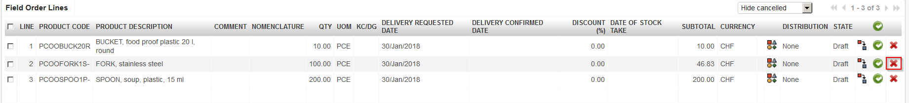 2- For cancelling one specific Line, using the red cross on the line level as below