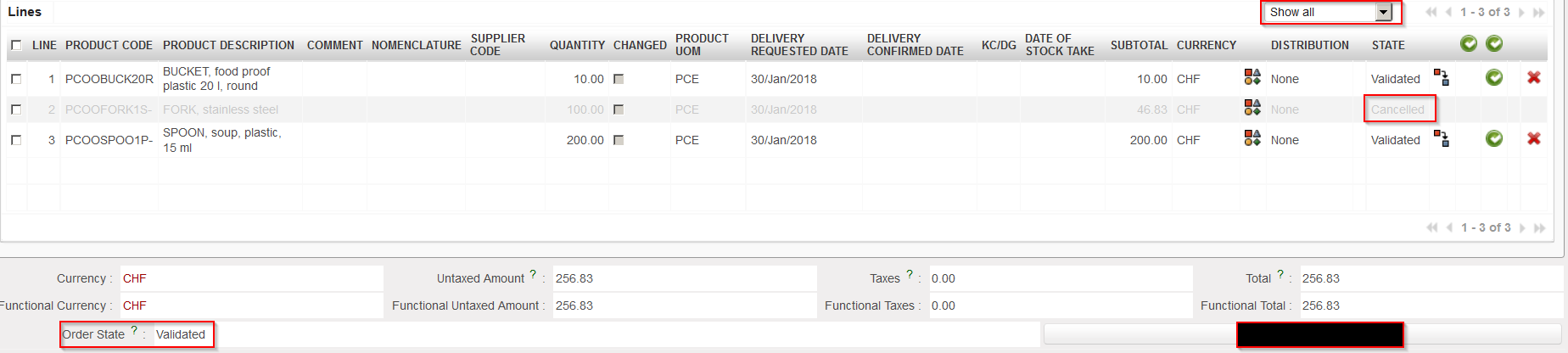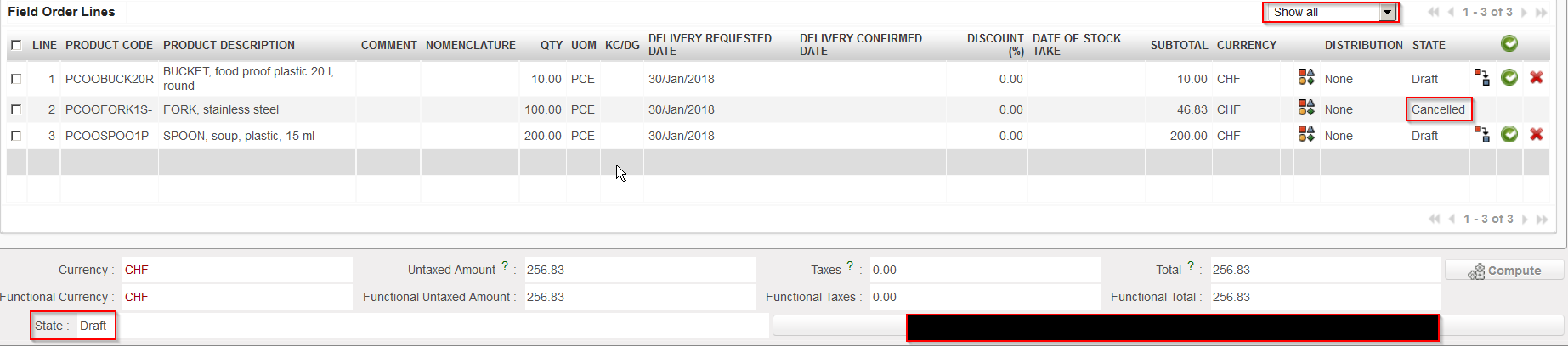 The FO will stay in status “Draft” but the cancelled line will switch to state “Cancelled“.