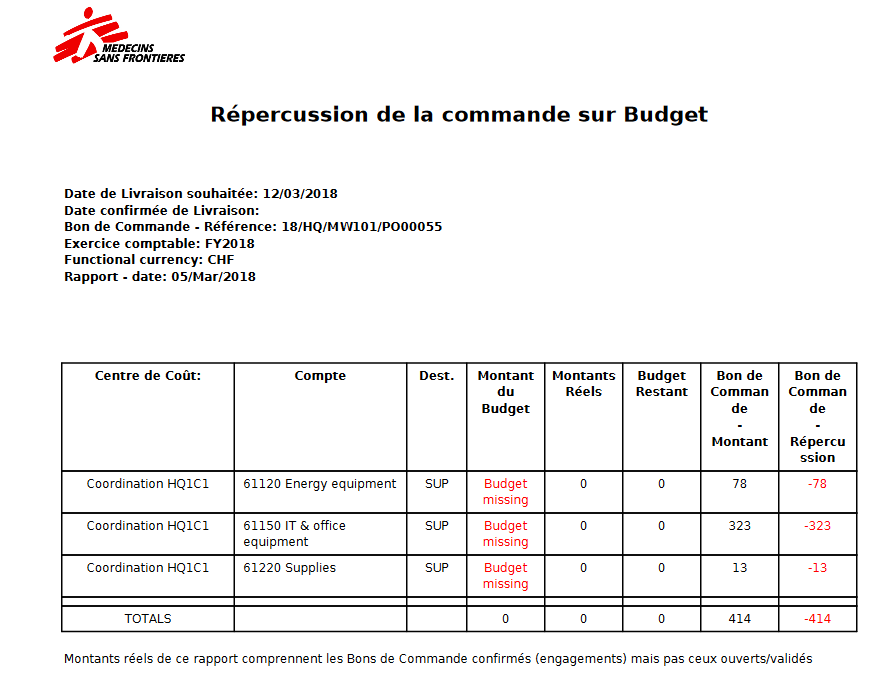- Le “Montant du budget, Budget amount” provient du budget chargé dans le système et correspondant au centre de coûts auquel le PO a été attribué. Si plusieurs versions d’un budget ont été chargées, le rapport sélectionnera la version la plus récente qui ne soit pas en mode brouillon.