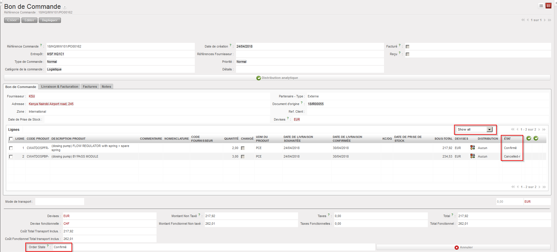 Sur le PO, la ligne correspondante passe au statut “Cancelled-r” tandis que le PO (au niveau entête) et les autres lignes conservent le statut “Confirmé”.