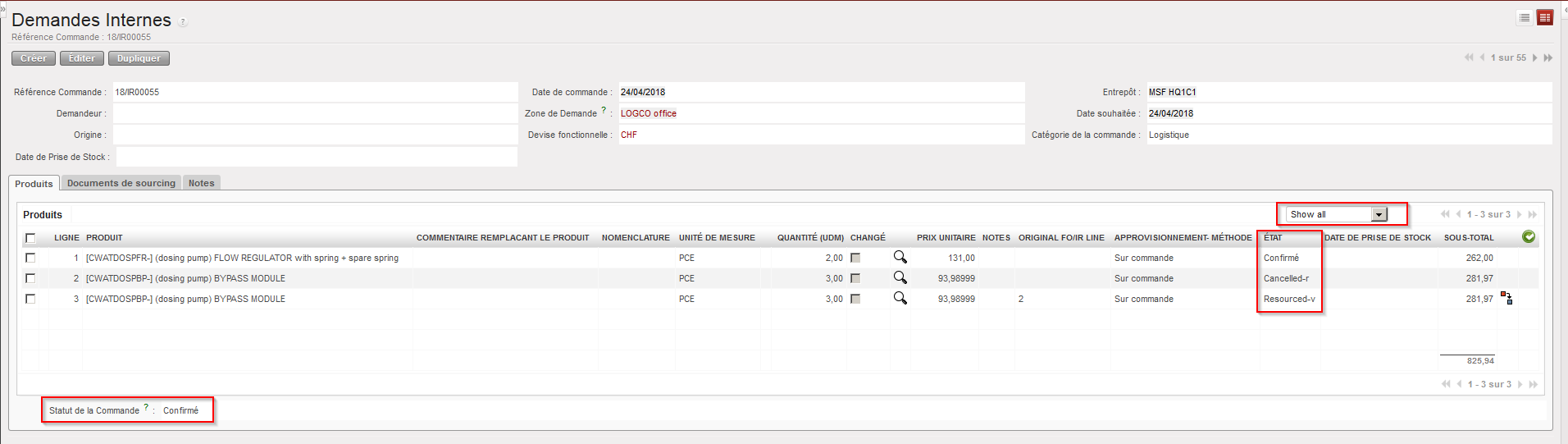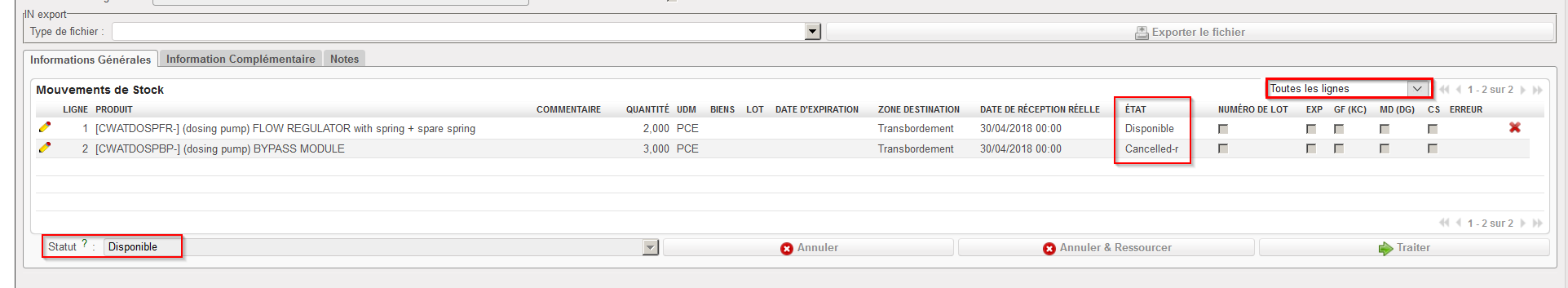 Sur le IN, la ligne annulée et ressourcée passe au statut “Cancelled-r”. Le IN (au niveau entête) et les autres lignes conservent le statut “Disponible”.