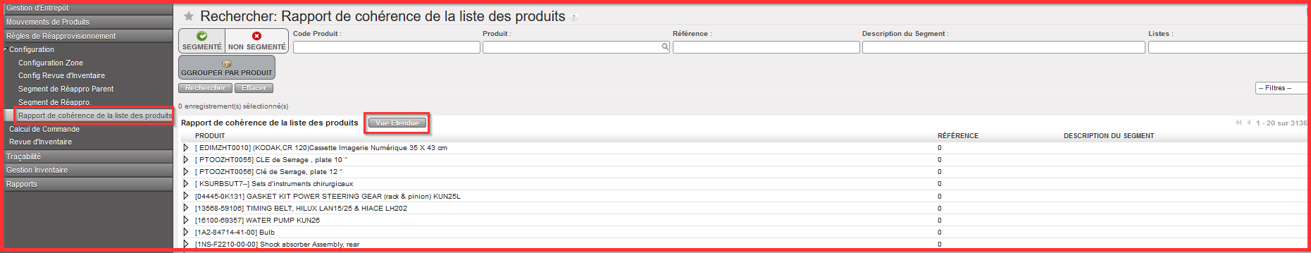 Aller à : Entrepôt /Règles de Réapprovisionnement / Configuration/ Rapport de cohérence de la liste des produits