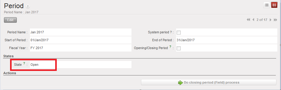 However you will not be able to close a period if the previous one is {Open} or {Draft}. For instance, if you start using UniField in May, you will open the May period and leave the previous period {Draft}. When you will close May, you will have to open the previous periods and close them before closing May.
