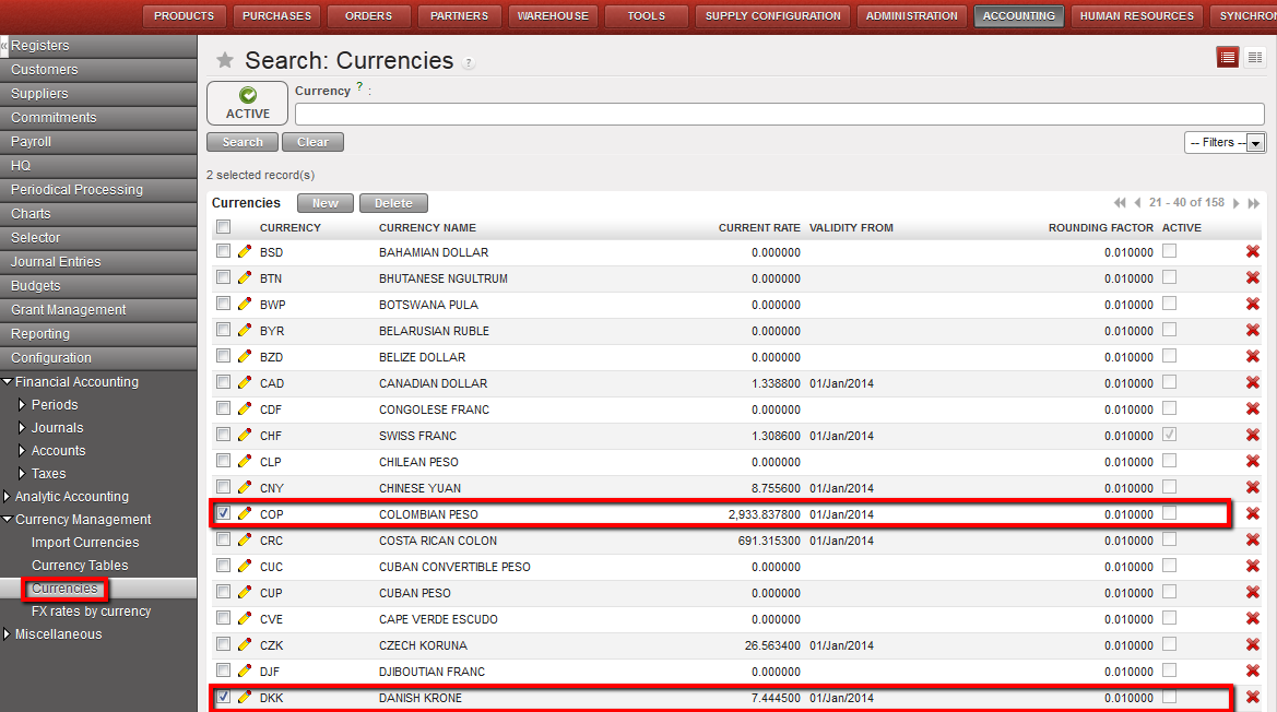 2. Select the currencies to activate. Here we want to activate DKK and COP.