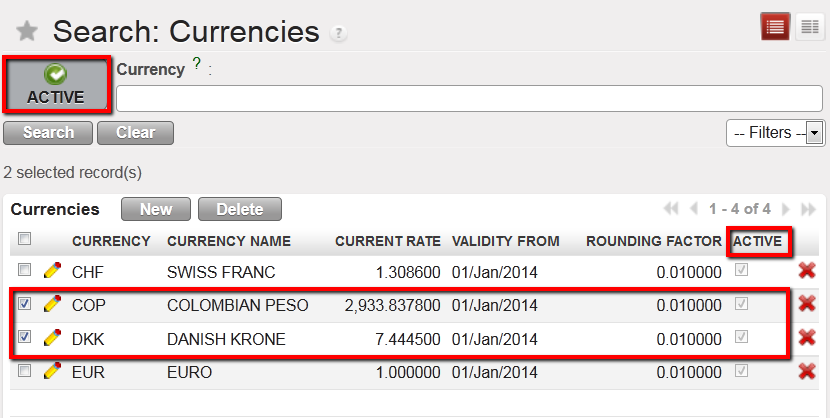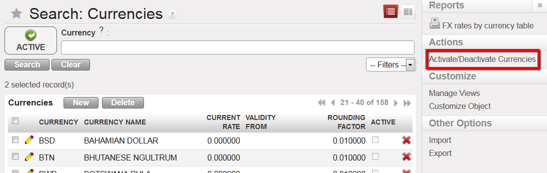 - Check whether the currencies were activated in the currencies search view by selecting the Active filter