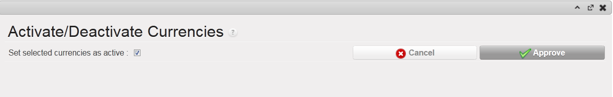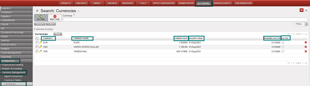 Imported or manually created currencies need to be activated or the user will not be able to record entries in such currency. When a currency is not needed anymore (e.g. because it is not used locally anymore), it can be manually inactivated.
