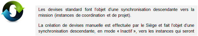 Pour une utilisation spécifique sur le terrain, une devise non standard peut être créée manuellement par le Siège, puis synchronisée avec le terrain, en mode « Inactif » également.