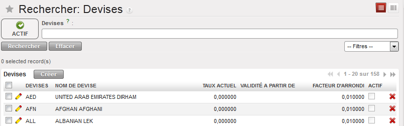 - Dans UniField, sélectionnez Comptabilité/Configuration/Gestion de Devises /Devises