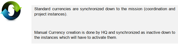When a new mission is opened, a list of standard currencies is loaded at HQ level with current FX rates and then synchronized as inactive to the field. For specific use in the field, a non-standard currency can be created manually by HQ and synchronized to the field as inactive, too.